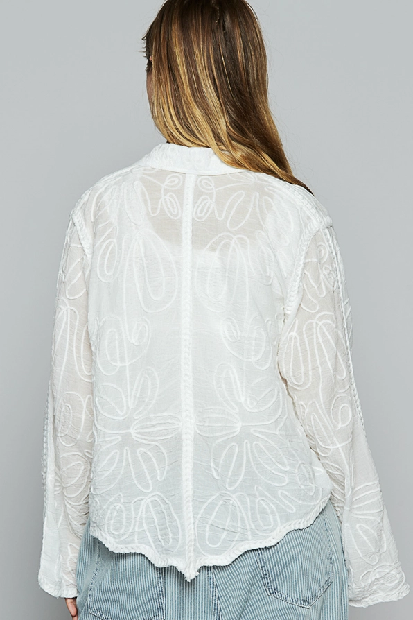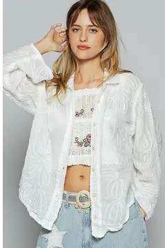 This lightweight cotton button up features tonal crochet details throughout, with a light airy feel and a relaxed fit.