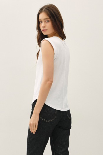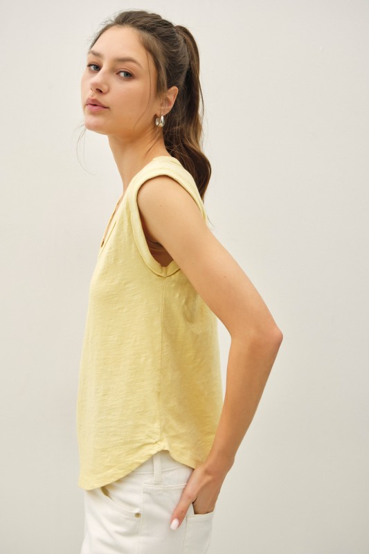 This casual scoop neck tee is almost a tank but has the slighted cap sleeve with a stylish folded cuff.